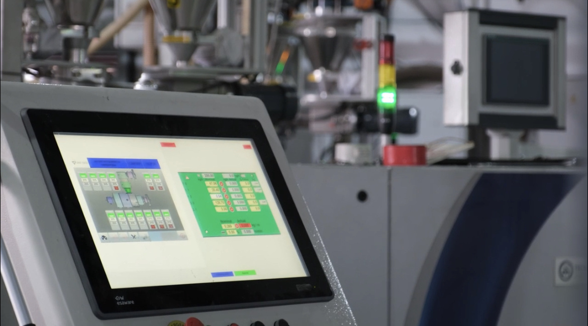 На каждой линии стоит специальная система гравиметрического дозирования, которая регулярно калибруется и очень точными дозами отмеряет материал для подачи его дальше. Информация с этой системы поступает в общую, которая управляет линией, координируя работу остальных агрегатов, незначительно замедляя или ускоряя линию, для того, чтобы получить равномерный расход материала и высокую геометрическую точность и качество продукции.