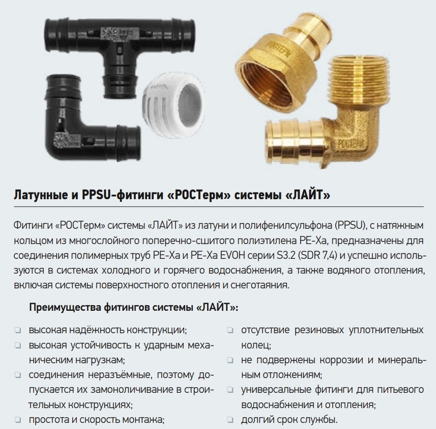 Фитинги системы «ЛАЙТ» предназначены для соединения полимерных труб РЕ-Хa и PE-Xa EVOH серии SDR 7,4. Данные фитинги находят широкое применение в системах холодного и горячего водоснабжения, водяного отопления, включая системы поверхностного отопления и снеготаяния.
