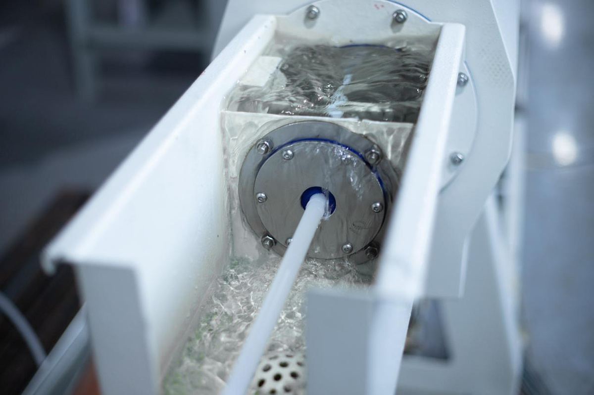 Охлаждение труб на производстве компании «РОСТерм» осуществляется в специализированных ваннах, где используется циркулирующая вода, охлаждаемая чиллером. Этот процесс начинается сразу после экструзии, когда материал ещё горячий и нуждается в быстром охлаждении для стабилизации размеров и придания окончательной формы. Вода циркулирует через систему ванн, поддерживая постоянную температуру, необходимую для равномерного и эффективного охлаждения труб.