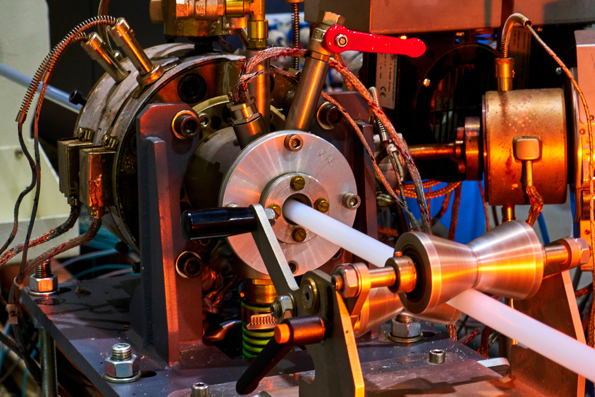 Процесс производства начинается с экструзии, когда сырьё подаётся в основной экструдер, где оно плавится и приобретает однородную консистенцию. Затем расплавленный материал проходит через формующую головку, придающую трубе необходимую геометрию. После этого труба попадает в калибратор, где она обретает окончательные параметры, такие как, например, внешний диаметр, соответствующие требованиям ГОСТа. Далее следует процесс охлаждения, при котором труба проходит через ванны с циркулирующей водой, чтобы обеспечить необходимую температуру и избежать деформаций.