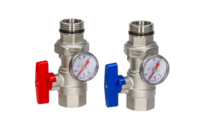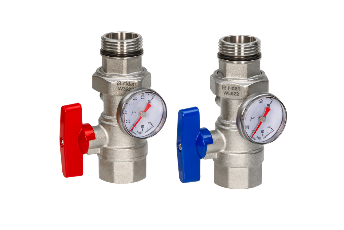 Шаровые краны R-BV (088U0822R) одной стороной подключаются к коллекторам серии SSM или FHF, другой стороной к смесительным узлам серии FHM-CR. В конструкции шаровых кранов установлены термометры. Краны изготовлены из никелированной латуни марки CW617N, в комплекте R-BV поставляются 2 шаровых крана, один с красной рукояткой, другой с синей рукояткой.