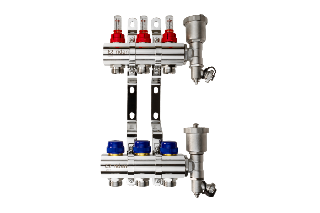 - Комплект поставки: подающий коллектор с расходомерами; обратный коллектор с клапанными вставками; торцевая секция с автоматическим воздухоотводчиком и сливным краном (2 шт.); кронштейны; инструкция на русском языке