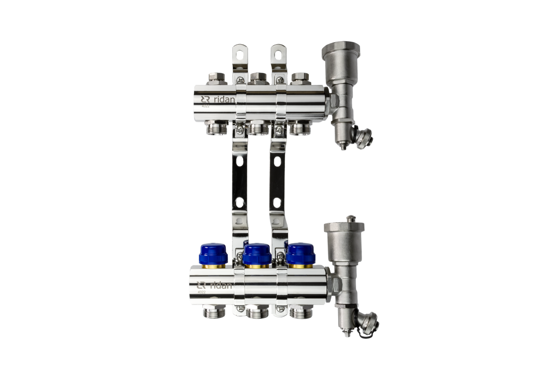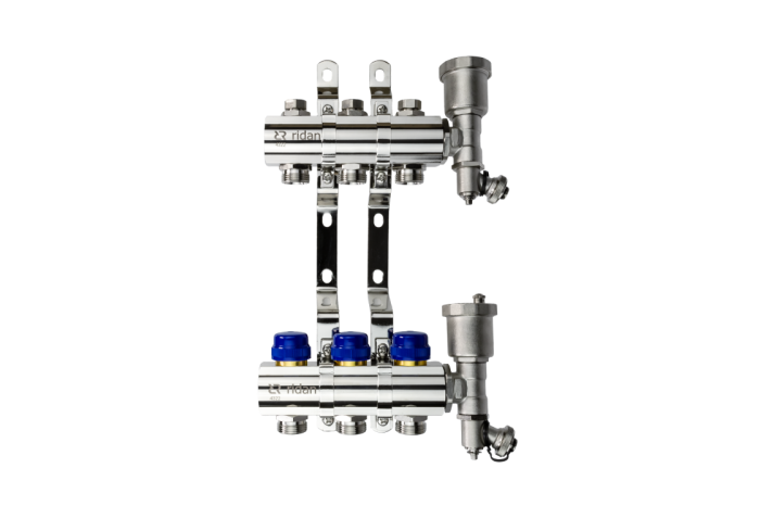 - Комплект поставки: подающий коллектор с запорными клапанами; обратный коллектор с клапанными вставками; торцевая секция с автоматическим воздухоотводчиком и сливным краном (2 шт.); кронштейны; инструкция на русском языке