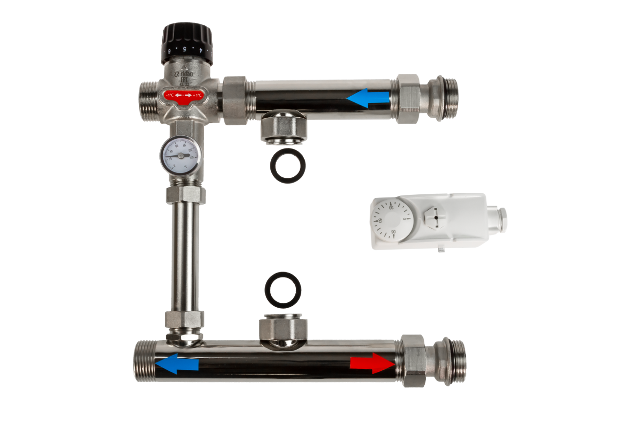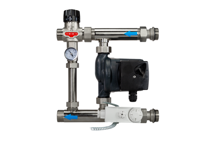 Компактные смесительные узлы используют для регулирования расхода и температуры теплоносителя, подаваемого в систему гидравлического напольного отопления. Конструкция смесительного узла позволяет монтировать его как с левой, так и с правой стороны распределительного коллектора. Подключение подающего и обратного трубопроводов производится с соблюдением направления стрелок потоков.