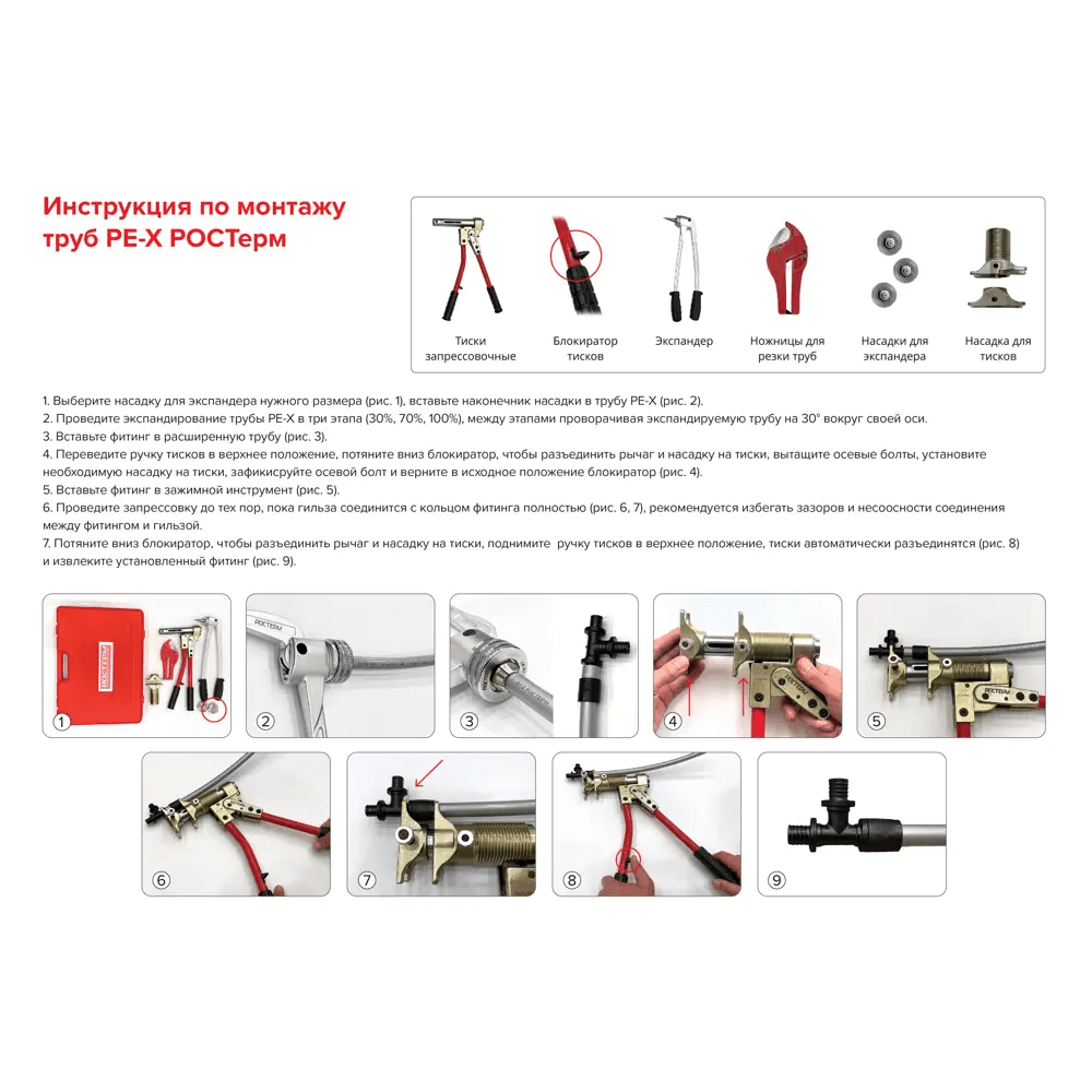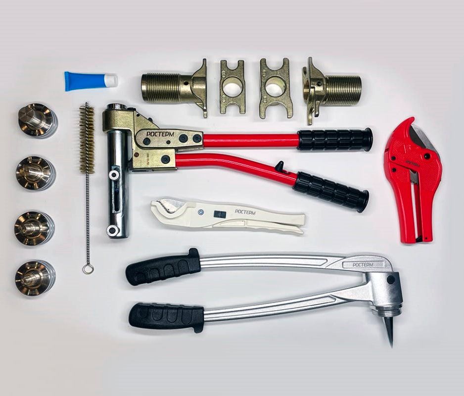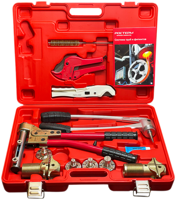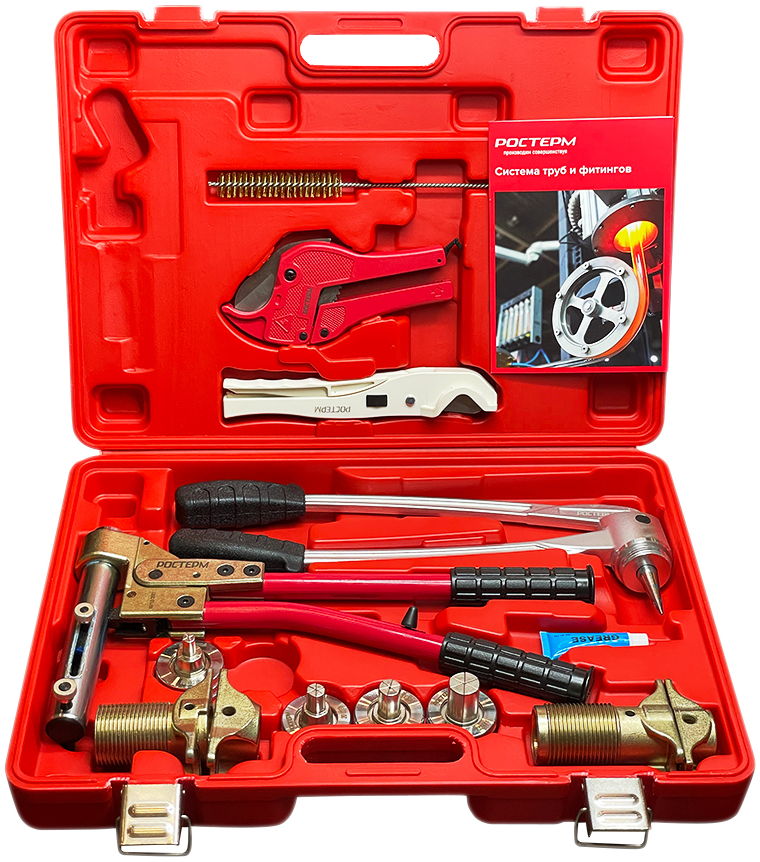 Комплект инструментов для PEX-труб с системой аксиальных фитингов от РОСТерм предназначен для монтажа труб из сшитого полиэтилена РЕХ. Подходит для труб диаметром: 16, 20, 25 и 32 мм. Упакован в прочный пластиковый кейс, вес изделия составляет 7,8 кг.